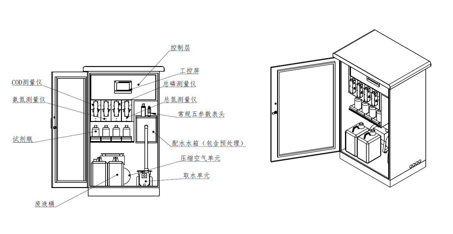 集成化設(shè)計(jì):常規(guī)五參數(shù)和四大參數(shù)分別集成為二個(gè)測試單元,使用一個(gè)大屏顯示和控制。使系統(tǒng)體積大幅降低,占地面積小,便于遷移、運(yùn)輸和安裝,減少了對環(huán)境的影響和人力、物力及財(cái)力的浪費(fèi)。可連續(xù)監(jiān)測包括水溫、pH、溶解氧、電導(dǎo)率、濁度、高錳酸鹽指數(shù)、氨氮、總磷、總氮等多種水質(zhì)參數(shù)。